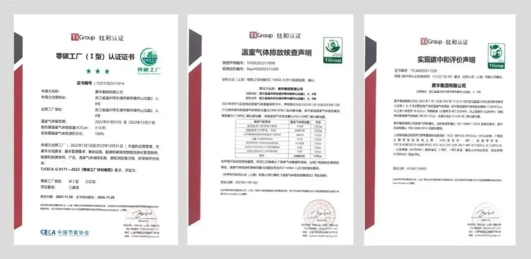 2023年11月30日,钛和认证依据(T/CECA-G0171-2022)《零碳工厂评价规范》,对黄华集团有限公司进行了综合评估,认证其完成了对直接温室气体排放和外购能源带来间接温室气体的100%抵消,获得钛和认证颁发的(Ⅰ型)三星级零碳工厂证书。