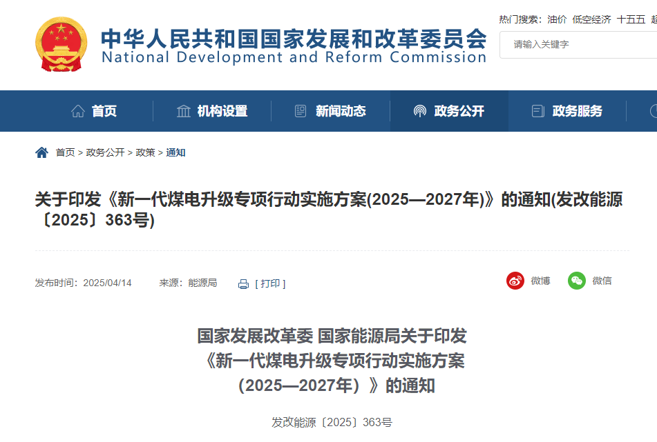 《新一代煤电升级专项行动实施方案(2025—2027年)》的通知各省、自治区、直辖市、新疆生产建设兵团发展改革委、能源局,北京市城市管理委员会,国家能源局各派出机构,国家电网有限公司、中国南方电网有限责任公司、中国华能集团有限公司、中国大唐集团有限公司、中国华电集团有限公司、国家电力投资集团有限公司、中国长江三峡集团有限公司、国家能源投资集团有限公司、国家开发投资集团有限公司、华润(集团)有限公司、中国中煤能源集团有限公司、中国国际工程咨询有限公司,中国电力企业联合会,电力规划设计总院、水电水利规划设计总院: