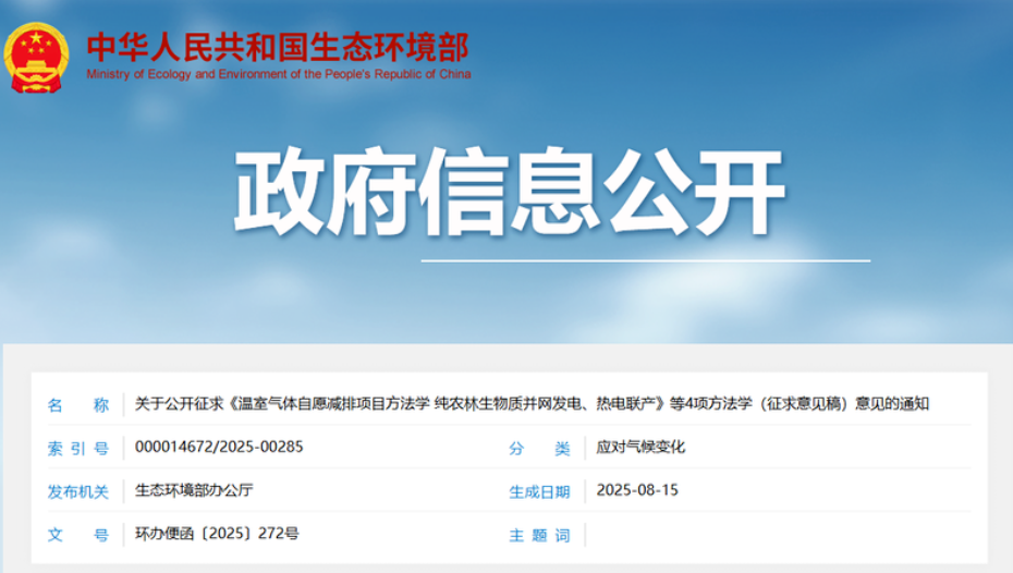 关于公开征求《温室气体自愿减排项目方法学 纯农林生物质并网发电、热电联产》等4项方法学(征求意见稿)意见的通知