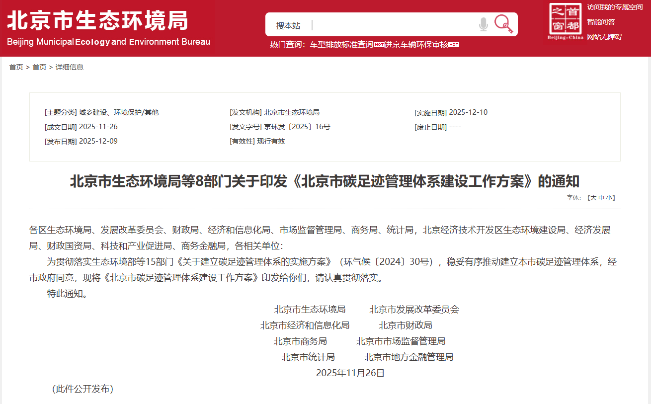 12月10日,北京市生态环境局等8部门印发《北京市碳足迹管理体系建设工作方案》。《方案》提出,到2027年,本市碳足迹管理体系初步建立,制定发布10个以上重点产品和典型服务碳足迹核算方法的标准或技术规范,完成15个产品或服务的碳足迹认证,培育一批专业服务机构。到2030年,本市碳足迹管理体系更加完善。