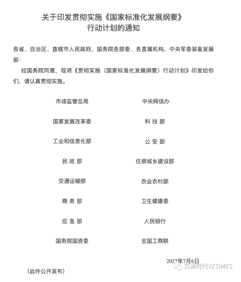 国家发展改革委、市场监管总局、中央网信办、科技部、工业和信息化部、公安部、民政部、住房城乡建设部、交通运输部、农业农村部、商务部、卫生健康委、应急部、人民银行、国务院国资委、全国工商联16部门联合发布《贯彻实施〈国家标准化发展纲要〉行动计划》(简称《行动计划》)。
